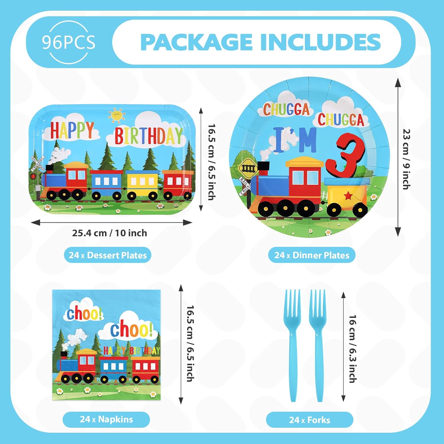 96 Pcs Train 3rd Birthday Party Decorations Chugga Chugga I'm 3 Plates and Napkins Disposable Railroad Transportation Tableware Set for Kids Train Theme 3 Years Old Birthday Party Supplies Serves 24