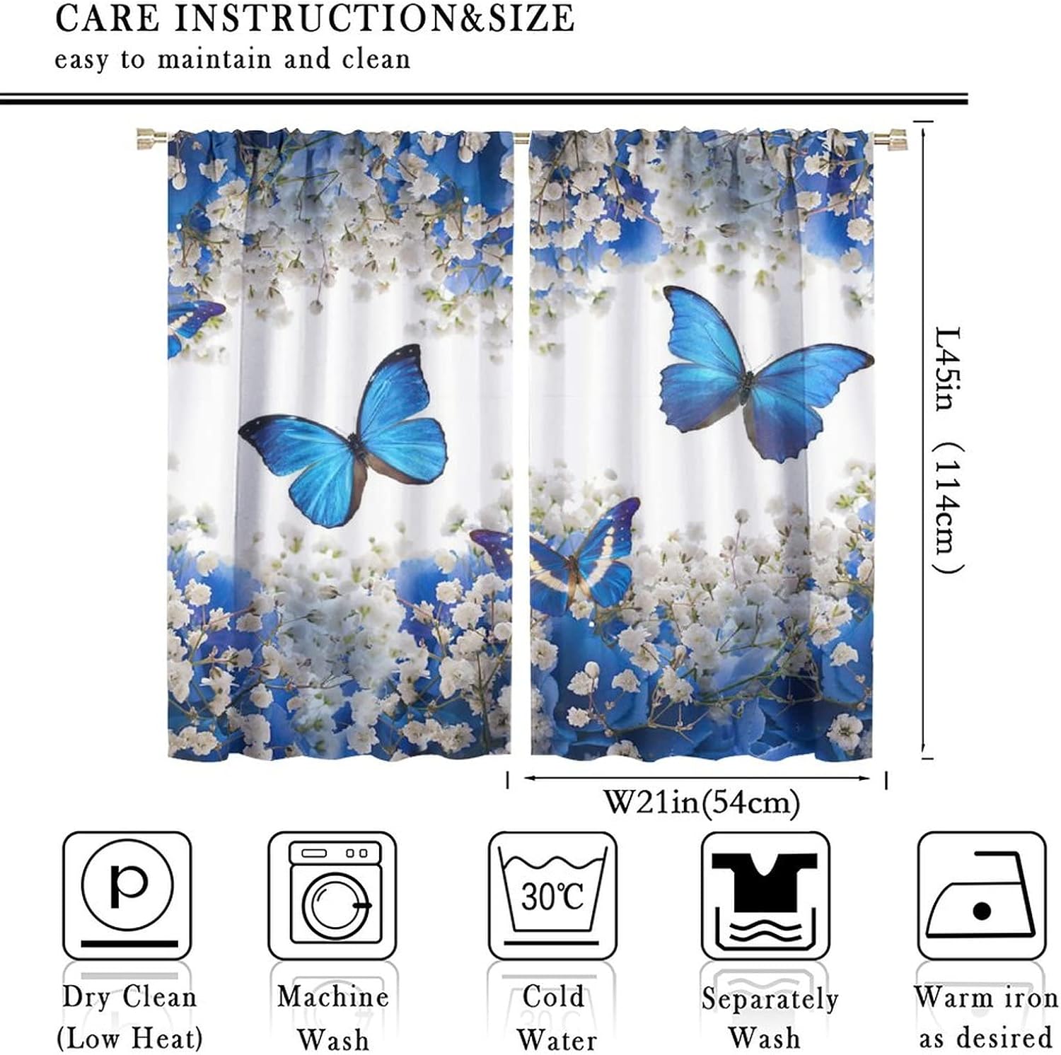 Package included:2 panels per package.Size:One panel measures 21" (W) x 45" (L). The overall size is 42"(W) x 45"(L).One panel piece measures 21" (W) x 54" (L). The overall size is 42"(W) x 54"(L).One panel piece measures 21" (W) x 63" (L). The overall size is 42"(W) x 63"(L).One panel piece measures 27.5" (W) x 63" (L). The overall size is 55" ( W ) x 63" ( L ).One panel piece measures 26" (W) x 84" (L). The overall size is 52" (W) x 84" (L).One panel piece measures 31.5" (W) x 63" (L). The overall size is 63" (W) x 63" (L).One panel piece measures 36" (W) x 63" (L). The overall size is 72" (W) x 63" (L).One panel piece measures 31.5" (W) x 72" (L). The overall size is 63" (w) x 72" (L).One panel piece measures 42" (W) x 84" (L). , The overall size is 84" (W) x 84" (L).About the material:1. Made of fiber polyester fabric.2. High color fastness, no fading even after long term use.3. No chemical coating, no odor, healthier and safer for people, especially for babies and children.About the function.1. It can block out 70%-90% of light and can protect privacy by blocking light or darkening the room.2. It is very suitable for bedroom, living room, kitchen, cafe, office, closet, door, bathroom, dining room, dormitory, nursery, outdoor patio, etc.3. It is also one of the best gifts for family, friends, relatives or yourself.Warm tips:1. Machine washable in cold water.2. The pattern is only on one side, the other side is white.3. Due to manual measurement, please allow 1-2 cm difference.Our service:We focus on customer satisfaction. If you have any questions or problems, please contact us by email, we will reply within 24 hours and provide a satisfactory solution.
