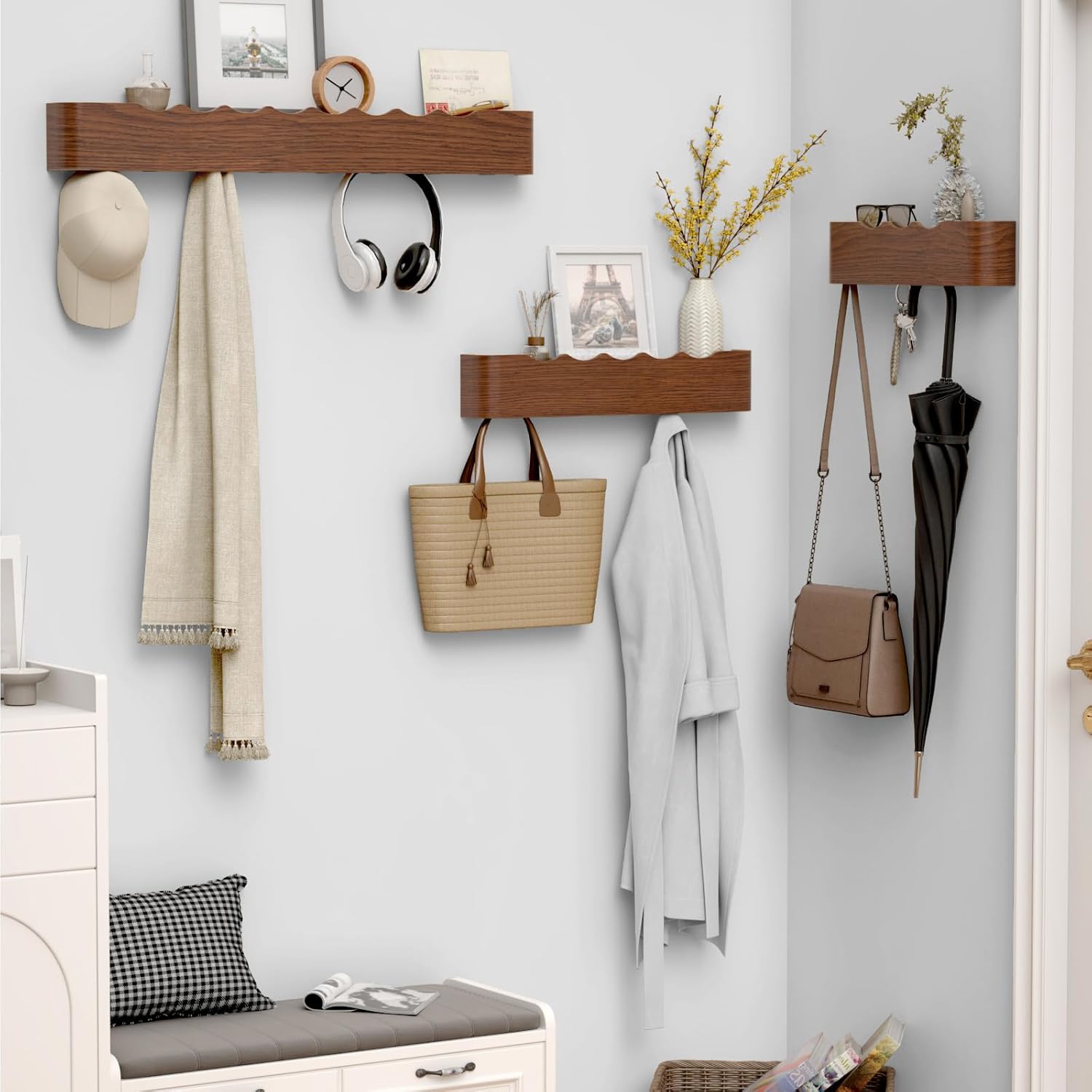 Crafted from high-quality wood, this coat rack combines durability with elegant design. Its gently waving curves add a touch of softness and richness to any room. Each hook has been rigorously tested for reliable weight capacity, ensuring secure and worry-free use. Available in 4, 5, or 8 hook options to suit your storage needs.