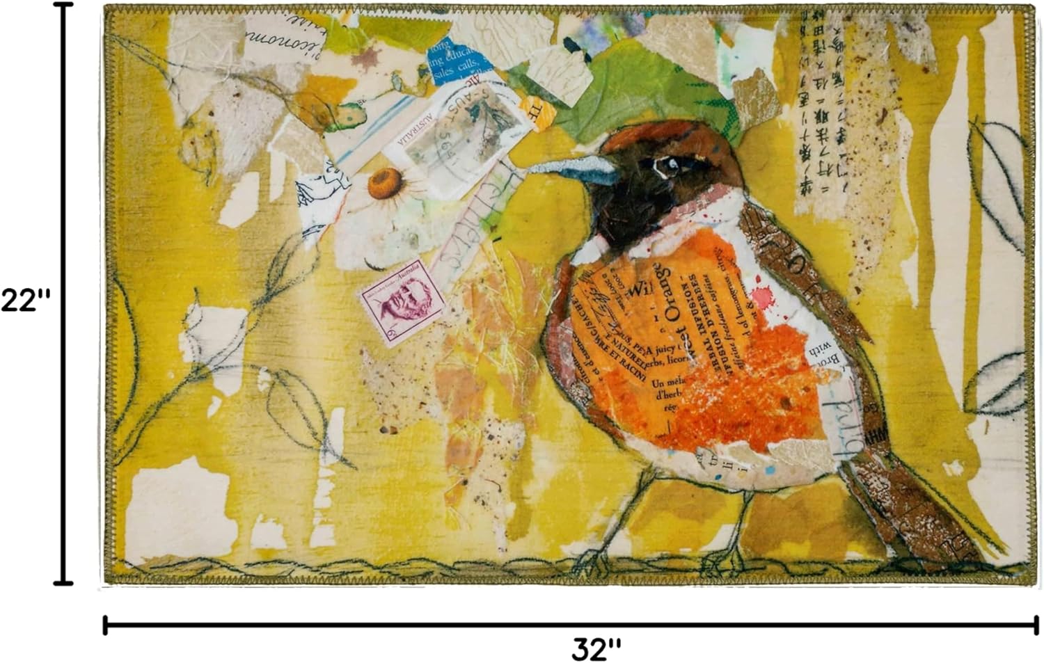 "Picture Perfect" Olivia's Home collection by Home Comfort. Printed with a soft, suede-feel texture, this Olivia’s Homeaccent rug was designed by American artist Elizabeth St. Hilaire. A bright bellied robin against a golden backdrop makes up the design of this Olivia’s Home accent rug. This low profile accent rug is machine washable and features a suede-like feel. Suitable for indoor use only, this design by Elizabeth St. Hilaire is machine washable for year round enjoyment. You can also layer this rug on a carpet for an extra layer of color. This machine washable accent rug is velvety soft to the touch and super thin to fit under the tightest of door frames. It also has a stitched edge for a finished look. You're going to love the ease of care with this great rug. Machine wash, vacuum, sweep, spot clean and you're good to go. We recommend using a rug pad or try carpet tape to hold your rug in place.