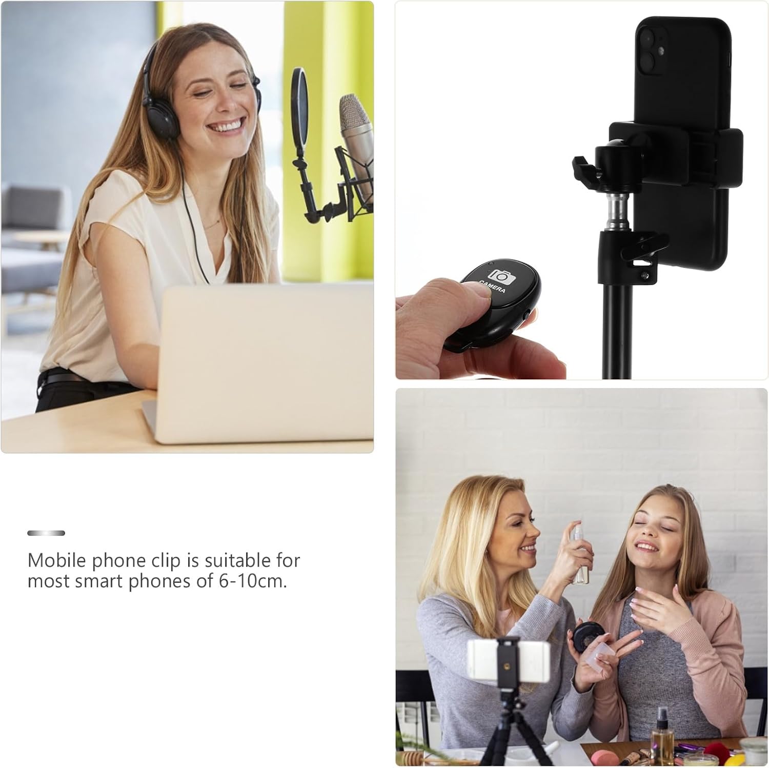 Package Include 1 1 x shutter 1 x phone clip 1 x connector Characteristics -Color: Black -Product Info: -Material: Stainless steel, iron, plastic -Size: About 160.00X32.00X32.00cm/62.88X12.58X12.58inch - Mobile phone clip is suitable for most smart phones of 6-10cm phone display stand. - This phone stand is suitable for desktop conferencing, live streaming and etc cell phone stand for desk. - The tripod can be folded, does not occupy recording stand. - Strong support and wider range of use for watching video movies, webcasts, etc holder. - Selected material, which is not easy to deform or break.Goods Informationmulti-function phone stand It is easy and convenient for you to have streaming or , etc.phone recording stand Share with your friends and families, convenient and practical.adjustable phone stand This is a live streaming phone stand, which is made of , durable and can be used for a long time