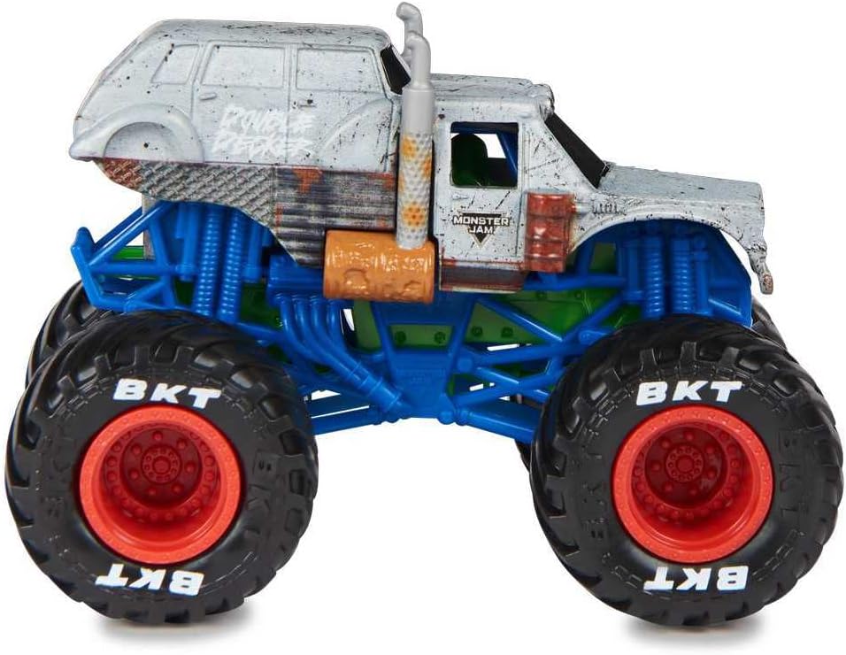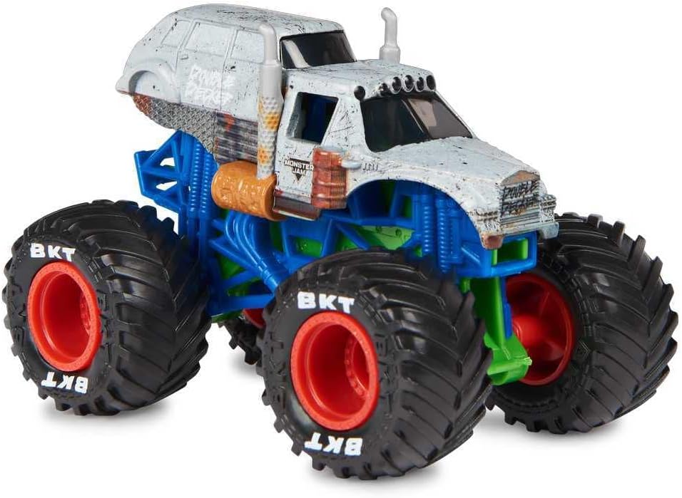 Monster Jam 2023 Spin Master 1:64 Diecast Truck Series 28 Steel Reveal Series Double Decker. Introducing the all-new, official 1:64 scale die-cast Monster Jam monster truck! This lean, mean, Monster Jam machine features awesome graphics and details. With official BKT Tires, stylized rims, and an authentic chassis, this monster truck embodies the style and swagger of its real-life counterpart! Each 1:64 scale toy truck comes complete with a driver molded into the driver’s seat. This 1:64 scale die-cast Monster Jam truck is just like the real thing – only fun size! Plus, easily keep track of your collection with the exclusive downloadable collector poster. Monster Jam monster truck toys are the perfect gifts for kids ages 3 and up. Bring home your favorite Monster Jam monster trucks and start building your collection today!