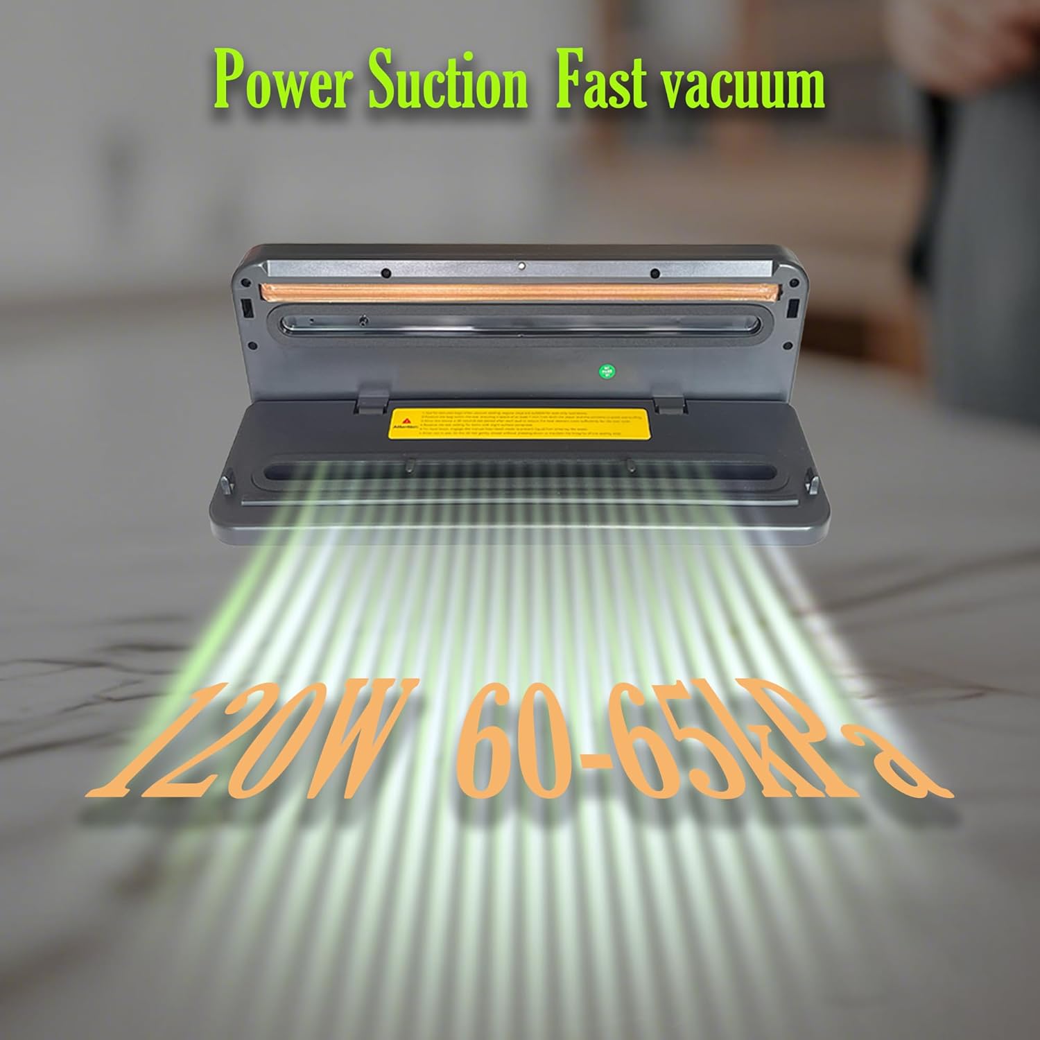 Product-related parameters: Product category: vacuum sealer Power: 120W Power supply: 110V-220V Vacuum: -0.06MPa-0.07MPa Sealing speed: 6-10s Seal width: 3mm Film thickness: 15 to 40 silk Maximum size for containers: bag width 11inch/28cm Conveying load: None Temperature control range: None