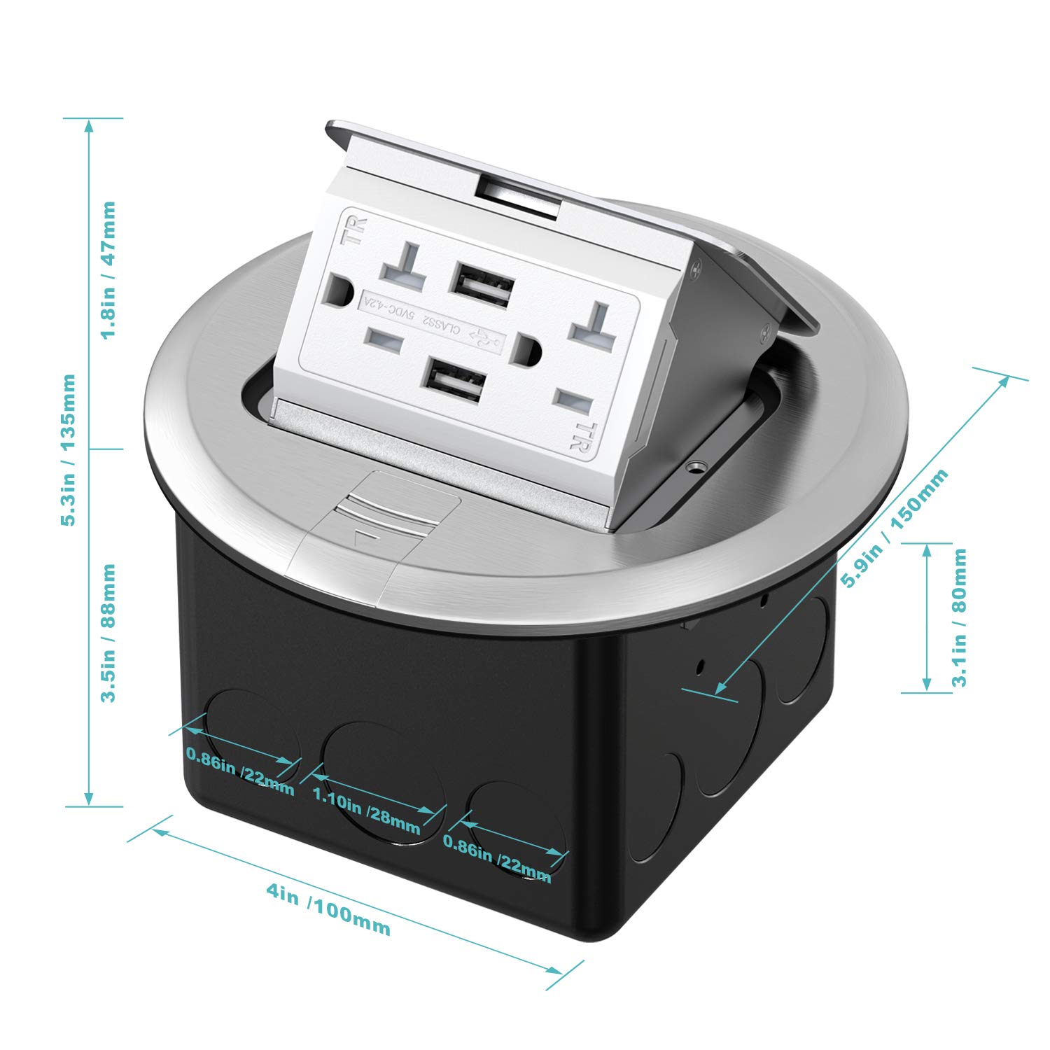 Improve the Functionality & Increase the ValueThis Roud Pop-Up floor box come in stylish stainless steel,finish making for the perfect match to any room flooring or surface.WEBANG floor box is the easiest way to add a modern touch to your room. It is a great product for your bedroom, living room, kitchen, bathroom counter, coffee shop, hotel lobby, and much more!High Quality Tamper Resistant & Weather Resistant ReceptaclesTamper resistant receptacles block access unless a 2 prong plug and usb ports are inserted.Water tight / corrosion resistant hardware ensures long life and reliable performance.Waterproof design on select models.Sleek Sophisticated Design for Better LivingWhen closed the pop up is hidden in your floor, all you see is a stylish stainless steel top. When you pull the button out the top tilts open revealing the power outlet.Featuring the unique capabilities of Top Greener universal cover designs, each floor box blends seamleslly into their environments.Made for both commerical and residential applications including wood, carptet floors, grapnite and marble countertops.Suited to meet all your power and communication needs!WARNING:To avoid the risk of fire, shock and/or death, turn power OFF at circuit breaker or fuse. Always test that the power is OFF before wiring.This device must be installed and used in accordance with appropriate electrical codes and regulations. Prohibition of children under 18 years of age.If you are unsure or uncomfortable with performing the installation, please consult a qualified electrician.It's our responsibility to provide our customers with quality products and services. If you have any questions about our products, please contact us, we will answer your questions within 24 hours.